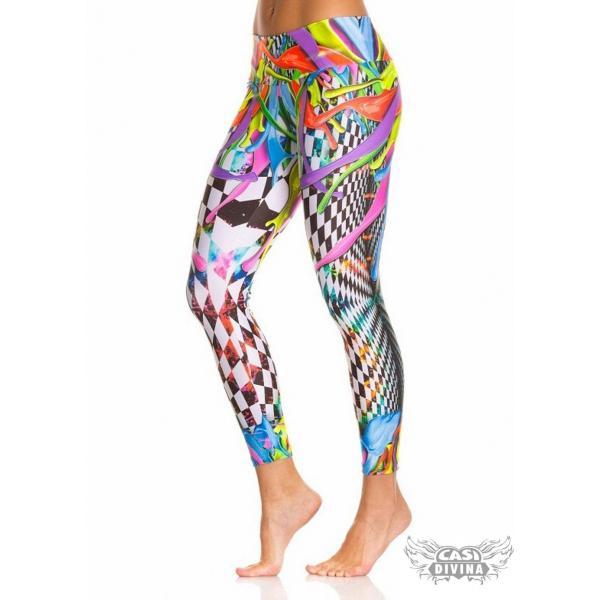 Legging perteneciente a la linea de deportiva "Alto Voltaje". Ha sido estampado mediante la técnica de sublimación y presenta un diseño de alto impacto visual de lenguas de pintura sobre un fondo de acabado damero, sobre posición que además de aportar color, da un volumen adicional a la prenda, haciéndola mas llamativa. Su tejido en supplex poliester con elastano, proporciona el acabado brillante y aporta la compresión necesaria para el efecto slim que se refuerza en la cintura donde la pletina ancha y reforzado dan sujeción extra al abdomen. Un legging singular para quienes huyen de lo aburrido y convencional.