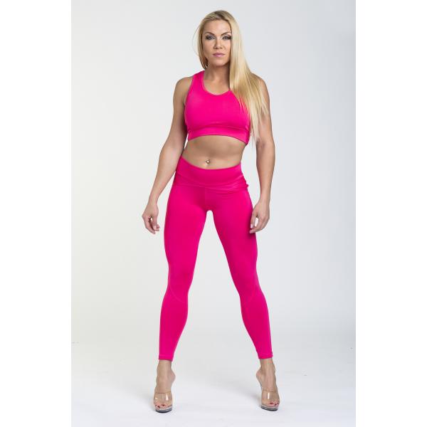 Conjunto deportivo compuesto por malla de corte capri con estampado rombos y top en un llamativo y femenino tono rosa a contraste